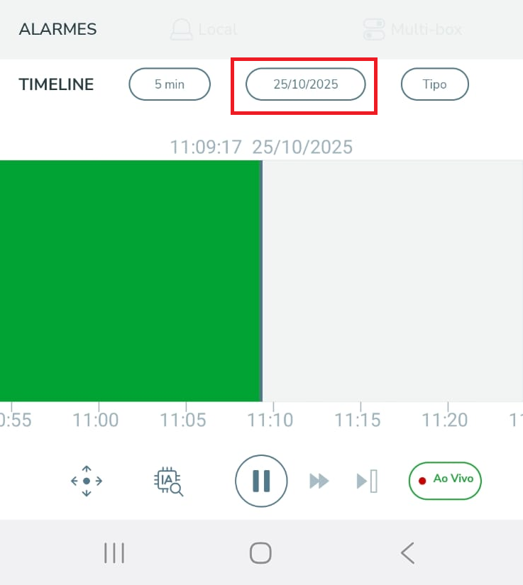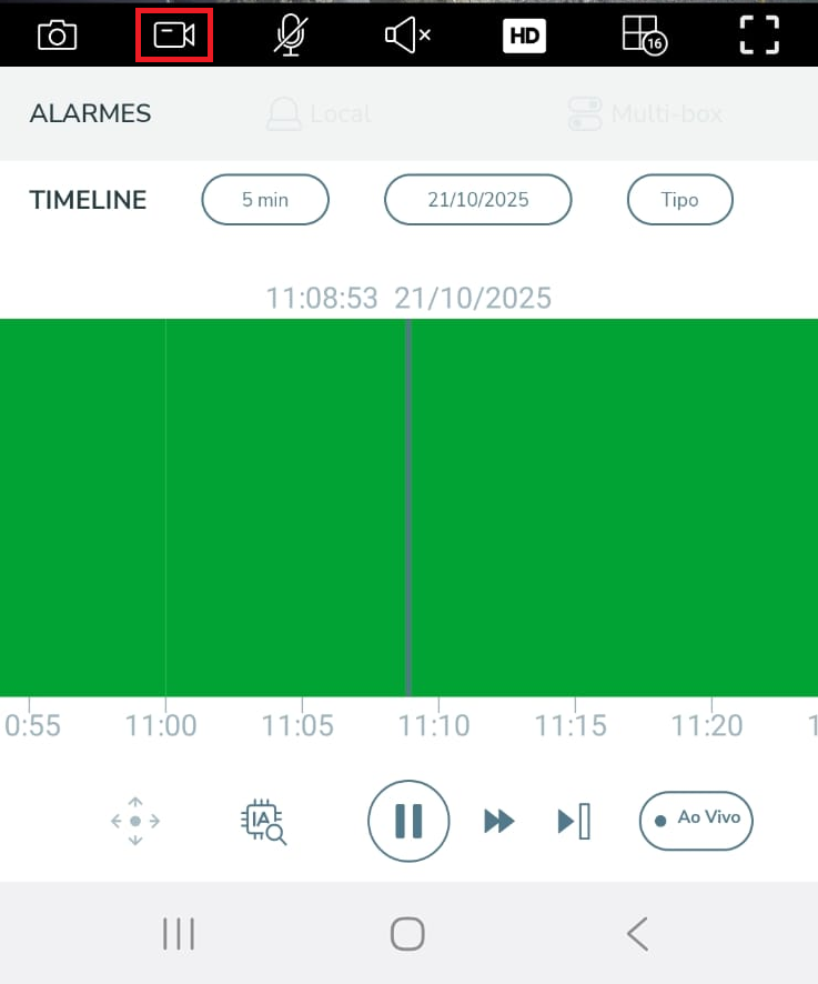 3. Após escolher a data e horário, clique sobre o ícone de filmadora para iniciar a gravação na galeria de vídeos e fotos do seu smartphone. Após completar o tempo desejado de gravação, clique novamente sobre o ícone de filmadora para pausar a gravação.